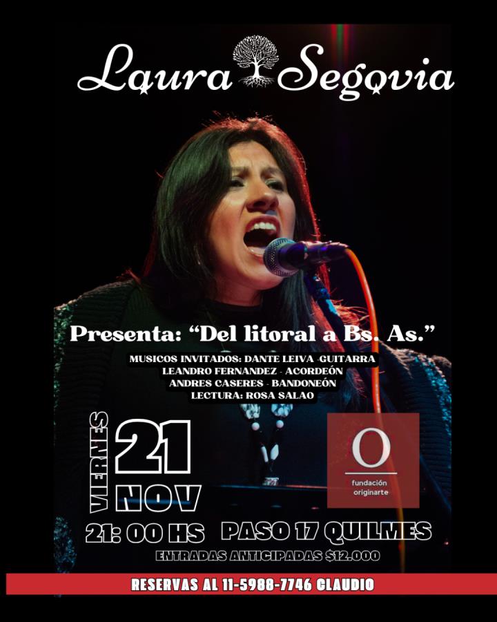 La cantante y docente Laura Segovia presenta su espectáculo Del litoral a Bs. As. el 21 de noviembre en la Fundación Originarte (Paso 17, Quilmes). Un concierto que combina música litoraleña, tango y poesía, inspirado en las raíces y trayectorias familiares que poblaron la ciudad. Con músicos invitados y lecturas en vivo, la propuesta conjuga arte, identidad y emoción. Entradas anticipadas: $10.000 – Info al 11-598-87746 Redes: @laurasegovia_musica